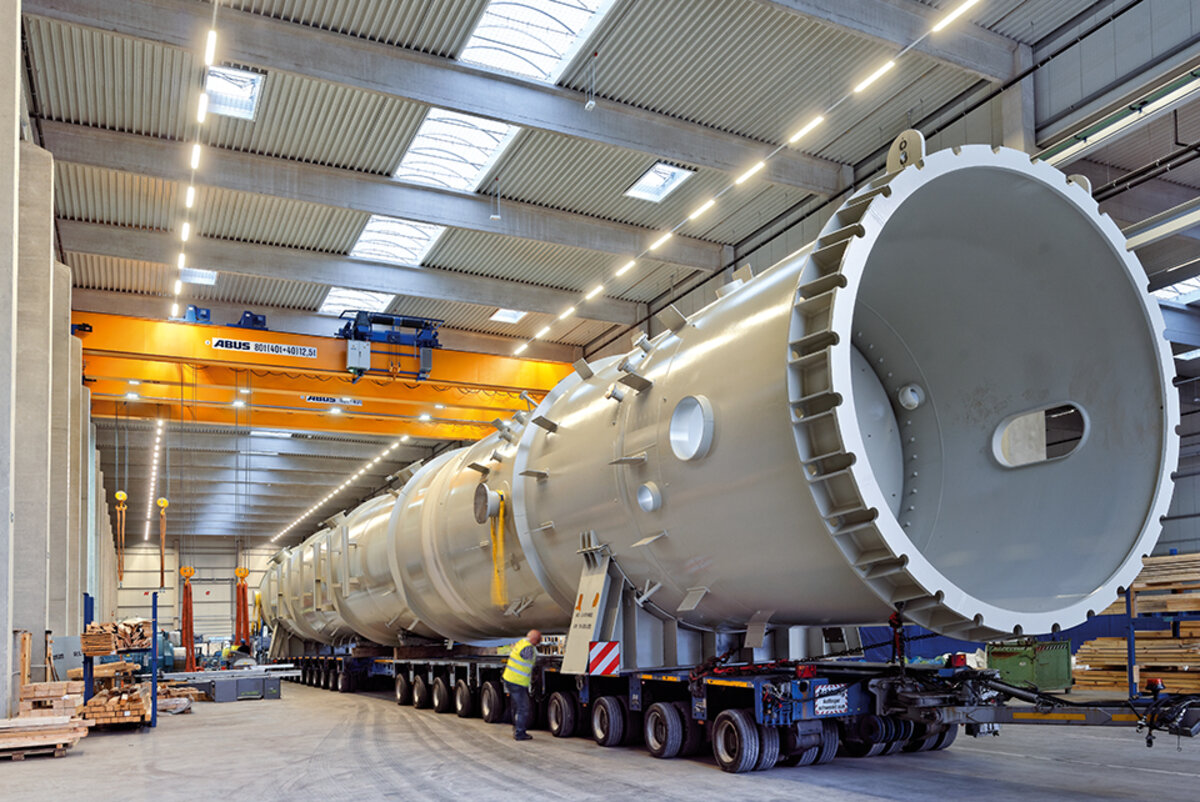 Die ABUS Gleichlaufregelung von zwei Katzen an einem Kran ermöglicht sicheres Handling von langen Produkten. Ein Auseinanderlaufen der Hubgeschwindigkeiten wird durch ständige Regelung selbst bei unterschiedlichen Seilzügen wirkungsvoll unterbunden. Vorausgesetzt der Kran ist mit Frequenzumrichter Heben ausgerüstet. Auch bei Kranen, die im Tandem laufen, werden die Fahrgeschwindigkeiten geregelt. Zwei Krane, maximal vier Katzen und Hub, alles geregelt.