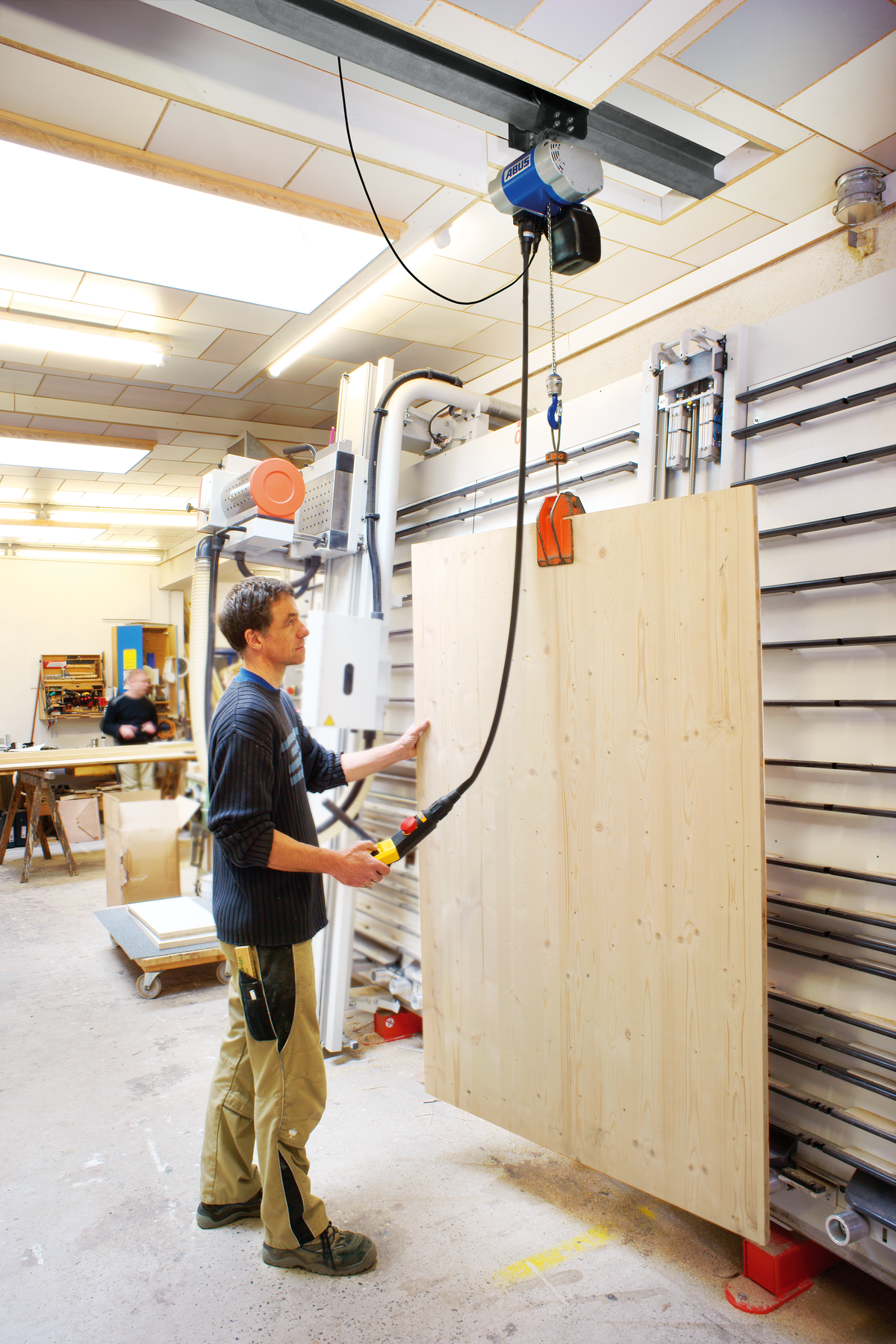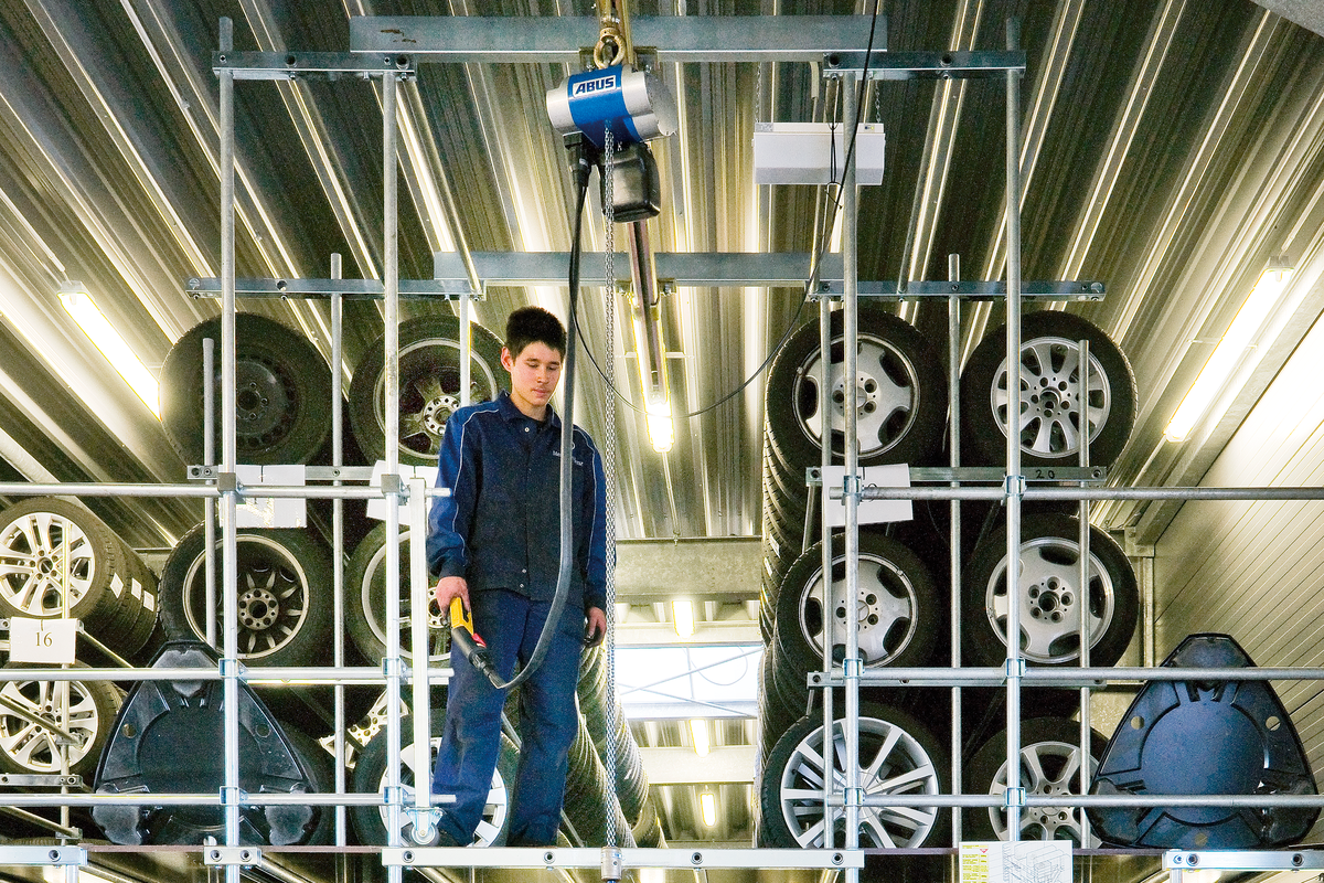 Er hebt Lasten bis 125 kg / 250 kg. Die Hubgeschwindigkeit lässt sich dabei stufenlos variieren. Die realisierbaren Hakenwege reichen bis 20 m / 10 m.