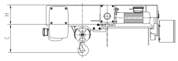 | Modell | Seileinscherung | Tragfähigkeit (t.) | Hakenweg (m) | C (mm) | H (mm) |