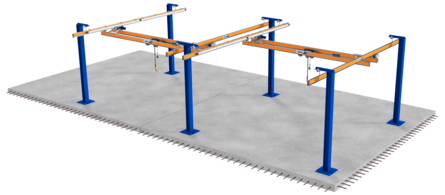 Kranbahnen können im Verbund mit Einspannstützen als gesamte Anlagen unabhängig von der sonstigen Hallengeometrie positioniert werden. Dies ermöglicht neue Materialwege und Arbeitsbereiche. Der Vorteil einer Anlage auf Ein spannstützen liegt in der Materialersparnis und der optimalen Zugänglichkeit für andere Maschinen oder Transportmittel. Während des Kranbetriebs entstehen Momente und Zugkräfte am Fußpunkt der Anlage, die über Dübelplatten in den Boden übertragen werden. Die Tragfähigkeit des Untergrunds ist entsprechend der eingeleiteten Kräften nachzuweisen. Bei Betonbodenplatten kann hierfür eine zusätzliche, statisch dimensionierte Bewehrung erforderlich sein.