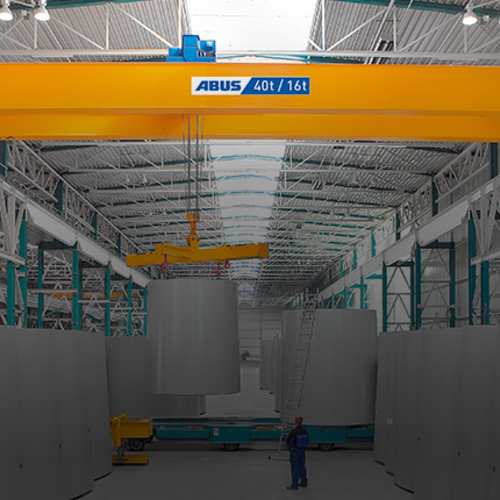 ABUS Polska lieferte zwei Laufkrane sowie einen freistehenden Säulenschwenkkran an das Rolls-Royce Service Center. Schwere Transportaufgaben werden in erster Linie von einem Zweiträgerlaufkran ZLK mit einer Spannweite von 18,2 m, auf dem zwei Elektro-Seilzüge mit einer Tragfähigkeit von 30 t bzw. 15 t betrieben werden, übernommen. Die Seilzüge sind mit einer Funkfernsteuerung für Tandembetrieb ausgestattet. Über ein LED Display wird das Gewicht der aktuell gehobenen Last angezeigt. Kran- und Katzfahrt werden durch Frequenzumrichter gesteuert, die eine sanfte Fahrkultur sowie eine einstellbare Beschleunigung ermöglichen. Ein auf einer zusätzlichen freistehenden Stahlbaukonstruktion installierter Einträgerlaufkran vom Typ ELV mit einer Spannweite von lediglich von 5 m unterstützt den ZLK Hauptkran. Auf dem ELV Kran kommt ein Elektro-Kettenzug Typ GM6 kompakter Bauart und mit einer Tragfähigkeit von 2 t zum Einsatz. Das „ABUS-Trio” wird durch einen Säulenschwenkkran Typ VS mit einer Auslegerlänge von 5 m und einer Tragfähigkeit von 3,2 t komplettiert. Der Schwenkbereich beträgt n x 360 (in beide Richtungen).