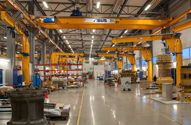 Auf der darunter liegenden Materialflussebene sorgen 19 ABUS Säulenschwenkkrane dafür, dass kleinere Komponenten mit einem Gewicht zwischen 2 und 3 t, die repariert und geprüft werden sollen, direkt am Arbeitsplatz des Technikers bewegt werden können. Der eingesetzte Krantyp VS mit einer robusten Stahlkonstruktion und einem niedrigbauenden Vollwandträger hebt Lasten von maximal 6,3 t und hat, in Abhängigkeit der Tragfähigkeit, eine Ausladung von bis zu 10 m. Ebenfalls in Abhängigkeit der Tragfähigkeit werden entweder ABUS Elektro-Kettenzüge (Lasten bis 4 t) oder Elektro-Seilzüge eingesetzt. Da die zu transportierenden Werkstücke ein Gewicht von 3 t nicht überschreiten, wurden alle Schwenkkrane mit Elektro-Kettenzügen ausgestattet.