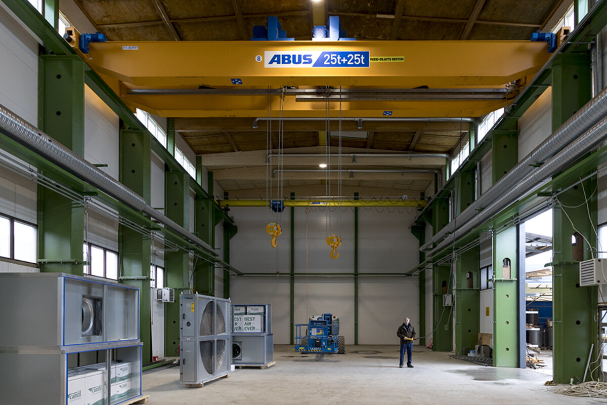 Im Frühjahr 2017 beschloss der Geschäftsführer Pekka Enne, die Produktionsanlagen zu erweitern und das Schweißen von Edelstahlblechen und schweren Blechprodukten in einem neuen Gebäude zu zentralisieren. In dieser neuen Produktionshalle mussten Lasten bis zu 50 t bis zu 10 m hoch gehoben werden. Konepaja Enne wählte einen ABUS Zweiträgerlaufkran ZLK mit zwei Seilzügen, die beide jeweils 25 t heben können. Der Kran hat eine Spannweite von 13.640 mm.