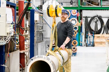 Die Kranbediener im RISE, die Durchflussmesser für die Ölindustrie testen und in den Testphasen längere Rohre mittels einer Traverse anschlagen müssen, schätzen am neuen Kran besonders die Lastpendeldämpfung, die gleichermaßen bei Fahrkomfort und Sicherheit punktet. Sie ermöglicht weniger erfahrenen Kranbedienern den sicheren Transport von Gütern auch in sensibleren Bereichen. Die Lastpendeldämpfung beruht auf einer mathematischen Berechnung, in die Fahrgeschwindigkeit, Beschleunigung und Verzögerung von Kran und Katze, die Hakenposition und die Länge des Lastaufnahmemittels einfließen. Neben der Lastpendeldämpfung bietet ABUControl eine Reihe weiterer Funktionen für einen optimalen Kranbetrieb: für einen hohen Fahrkomfort können ABUS Krane über Fahr- und Hubprofile an die aktuelle bzw. gewünschte Situation im Kranfahrbetrieb angepasst werden: so weisen z.B. Krane mit zwei festen Geschwindigkeiten andere Fahreigenschaften als frequenzumrichtergesteuerte Krane auf. Der im RISE eingesetzte Kran verfügt über ein Hebezeug. Kommen jedoch zwei Hebezeuge an einem Kran zum Einsatz oder sogar zwei Krane im Tandem mit jeweils zwei Hebezeugen, so sorgt die Gleichlaufregelung in der ABUControl Steuerung dafür, dass die Hubgeschwindigkeiten nicht auseinanderlaufen. Hierfür muss der Kran mit Frequenzumrichtern ausgerüstet sein. Ein Plus an Sicherheit und Komfort besonders beim Transport von langen Gütern.