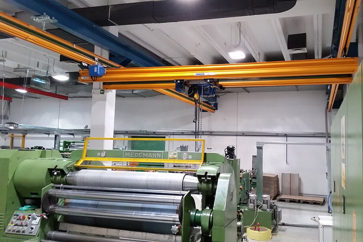 Eine der 7 Produktionsstätten befindet sich in Umag, im Norden Kroatiens. In diesem Werk ist man auf Tiefdruck und Laminierung sowie auf Wachsbeschichtung für die Verpackung von Produkten aus ausgewählten Branchen spezialisiert: so werden hier u.a. Verpackungen für Kaffee und Tee sowie Süßwaren hergestellt. Eine effiziente Herstellung der Verpackungen ohne Kran- und Hebezeugtechnik ist für die Aluflexpack Gruppe nicht denkbar. In der Fertigung wurden bereits vor einigen Jahren zwei ABUS Hängebahn-Systeme installiert. Es handelt sich um eine Installation mit Zweiträgerkranen des Typs ZHB mit einer Spannweite von 5 m und einer Bahnlänge von 16 m sowie einer Tragfähigkeit von 1,6 t. Als Hebezeug kommt ein Elektro-Kettenzug der Serie ABUCompact zum Einsatz. Der Elektrokettezug wird bei ZHB-Anlagen zwischen den Kranträgern angeordnet, was zu einem Zugewinn bei der Hakenhöhe und einer optimalen Raumnutzung beiträgt.