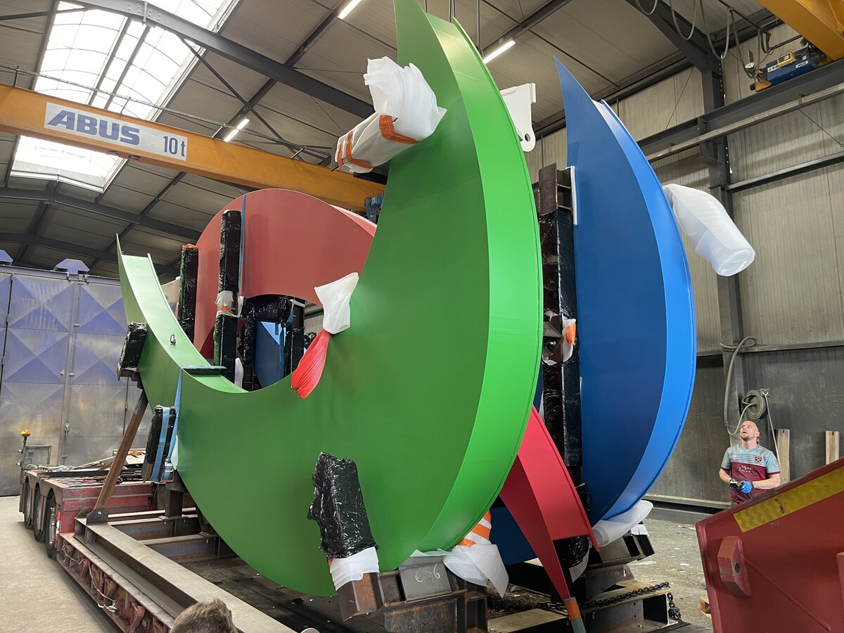 Die monumentalen Konstruktionen wurden in elf Segmenten mit jeweils 8 x 3 Metern in die Werkstätten von Chiarizia geliefert und wogen pro Element zwischen 1,4 und 3,5 Tonnen. Nach der Montage erreichte die Gesamtinstallation beeindruckende 29 Meter Breite und 13 Meter Höhe.